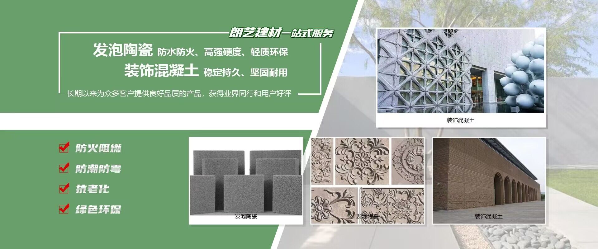 裝飾混凝土、發泡陶瓷實力廠家 成立于2006年,專業從事EPS、GRC、GRG、發泡陶瓷、裝飾混凝土等新型裝飾造型材料的設計、研發、生產和服務的綜合性企業